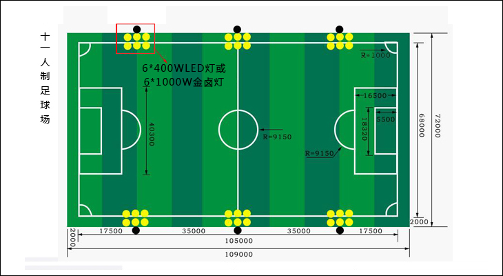 足球場燈光布局需要根據不同足球場尺寸和所使用的照度要求進行安排布局。 足球場按面積大小可分為以幾種尺寸: